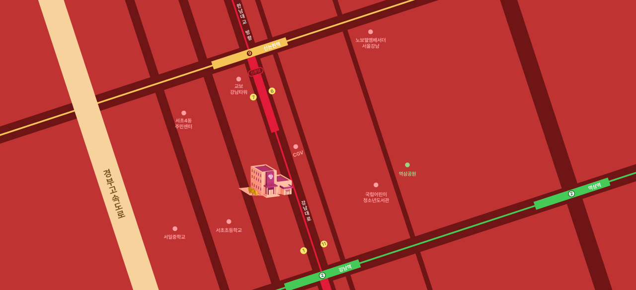 (2호선 강남역과 9호선 신논현역 사이에 있는 삼영빌딩 4층에 위치하고 있습니다.)